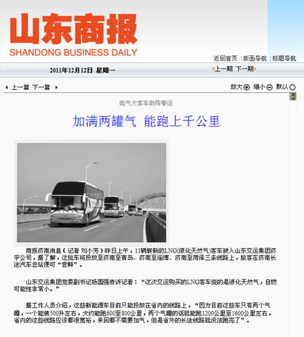 在采訪活動中,采訪團深入蘇州金龍客車制造車間,觀看了車輛從車架組裝、整車陰極電泳到制動配制等流水制造的全過程,體驗了客車制造的嚴密工序;在金龍客車廠產品展室,記者們了解了蘇州金龍客車廠的發展歷史及企業安全文化,對燃氣清潔能源客車所應用的新技術、新工藝、新材料有了更進一步的認識;在蘇州金龍客車廠會議室,總工程師張衛林將燃氣清潔能源客車與汽油、柴油等能源客車進行比對,向記者詳細介紹了燃氣清潔能源環保客車在安全、環保、節能等方面的優勢;在“山東交運集團清潔能源環保客車交車儀式”上,各新聞媒體記者又對本次燃氣清潔能源環保客車車輛安全運營、節能減排、線路投放等情況,進行了現場采訪和隨行拍攝。12月9日晚22點,集團公司燃氣清潔能源環保客車車隊經一路跋涉平安抵濟,12月10日晚,省電視臺山東衛視頻道在《新聞聯播》欄目、濟南市電視臺濟南新聞頻道在《濟南新聞》欄目以及《大眾日報》、《齊魯晚報》、《山東商報》、《生活日報》、《現代交通報》、《濟南日報》、《濟南時報》、《交通廣播》等媒體都對集團公司燃氣清潔能源環保客車投入春運情況進行了重點報道。