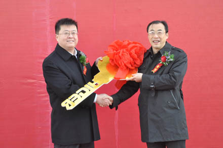 山東省交通運輸集團有限公司黨委副書記楊國強(左)和江蘇金龍客車有限公司黨委書記、新能源客車公司總經理謝飛鳴在交接現場。