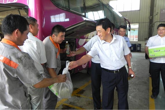 在汽車總站,吳董一行為奮戰在一線的員工送上內含小風扇、毛巾、清涼油、藿香正氣丸等防暑降溫物品的“清涼包”,對各崗位員工在炎熱天氣里堅守崗位、無私奉獻的精神給予肯定和感謝, 鼓勵大家時刻保持干勁,在工作中多創佳績,同時一定要注意防暑,保證健康。座談期間,吳董詳細聽取了總站“三嚴三實”教育工作匯報,對黨建工作與生產經營相結合等問題進行了指導,對下半年的各項工作提出了三點要求:一是要采用集體學習與個人學習相結合、與中心組學習相結合、與民主生活會相結合的方式,進一步抓好“三嚴三實”專題教育的學習和落實;二是開展“三嚴三實”專題教育要結合生產經營實際,以“三嚴三實”理論為基礎、精神為統領,促進各項工作順利開展;三是總站領導班子要以身作則,無論在生活上還是個人修養上,都要起到引領示范作用,始終保持良好的精神狀態,帶領廣大員工為完成全年工作任務而不懈努力。