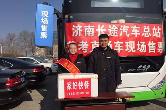 現場售票便利藝考 總站南北兩區均在考生集中的舜耕國際會展中心、濟南二中考點設立售票點,為廣大學子提供現場售票、免費接站、現場發車的便捷服務,節省了廣大學子在路途上的時間。同時提供 “藝考溫馨小貼士”,把各個考點的詳細信息、乘車班次、發車時間等信息發放給考生,方便出行。