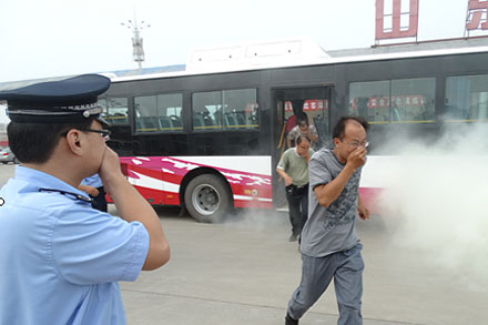 此次應急預案演練共設置了“車輛自燃突發事件演練”、“火災逃生演練”、“反恐防爆演練”、“消防滅火演練”等多個演練科目。“車輛突發事件演練”模擬客運車輛突發自燃事件,現場工作人員立即啟動應急預案,滅火小組迅速展開滅火,疏散引導組引導乘客逃生;“火災逃生演練”模擬候車室著火,現場工作人員迅速撥打119報警求助,并引導演練人員用毛巾等物品捂住口鼻,快速有序安全逃生;“反恐防爆演練”在候車室內進行,由工作人員用鋼叉等反恐器材制服出現在候車室內的暴徒;“消防滅火演練”在車場空地設置著火點一處,演練人員每五人一組進行滅火器滅火演練,消防救援組進行消防水槍滅火演練,應急救援組進行人員、物資搶救,重點檢驗滅火器、消防水槍的用法。
