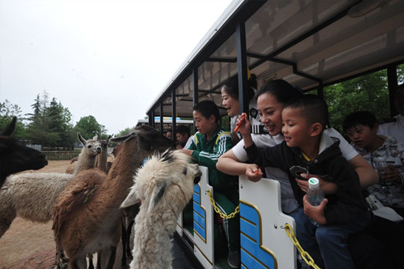 在建成不久的新濟南野生動物世界,福娃們在“愛心爸媽”的細心呵護下,乘坐小火車觀光游覽,與野生動物“親密接觸”,零距離觀察和了解麋鹿、斑馬、駱駝等動物的生活環境與生活習性,并興致勃勃地觀看了精彩紛呈的動物表演,歡樂的笑聲回蕩在整個公園。